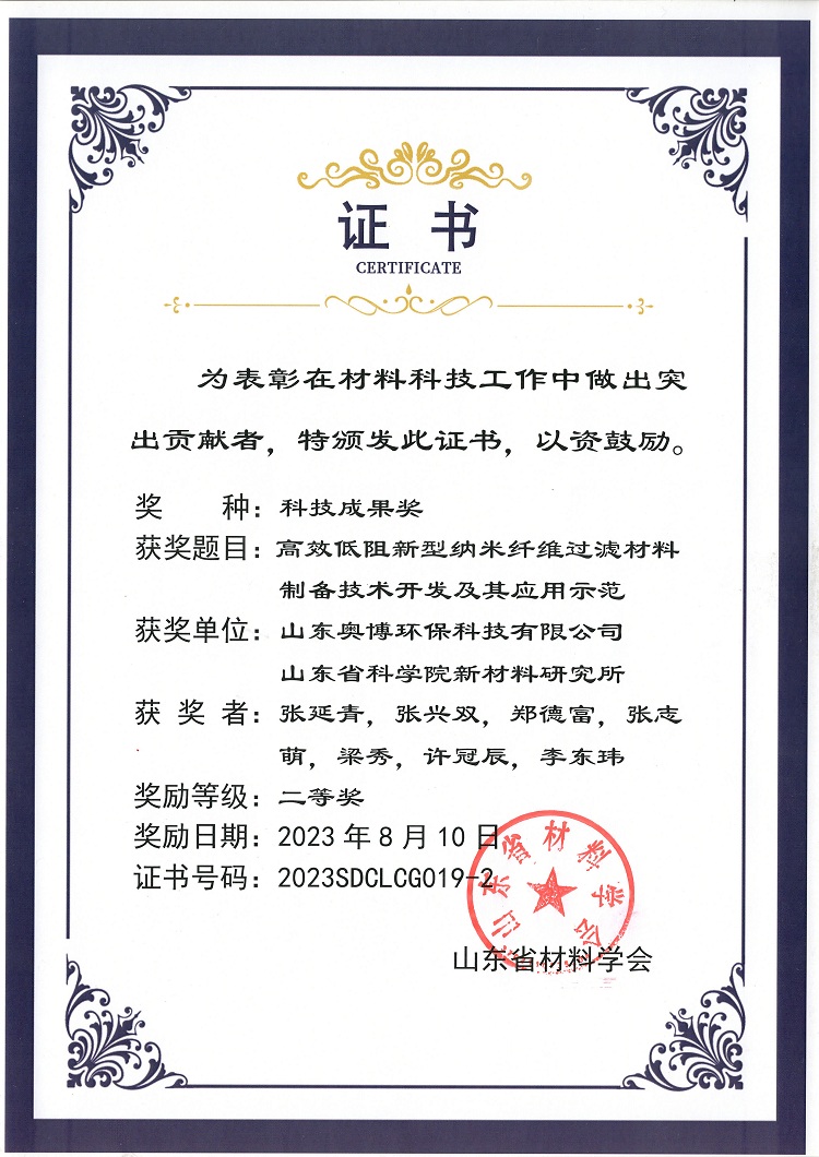 大會(huì)舉行的山東省材料科技成果頒獎(jiǎng)儀式,由山東奧博環(huán)??萍加邢薰九c山東省科學(xué)院新材料研究所,共同研發(fā)的“高效低阻新型納米纖維過(guò)濾材料制備技術(shù)開(kāi)發(fā)及其應(yīng)用示范”項(xiàng)目,以其優(yōu)秀的產(chǎn)品性能,廣泛的應(yīng)用領(lǐng)域及社會(huì)經(jīng)濟(jì)效益,榮獲二等獎(jiǎng)!